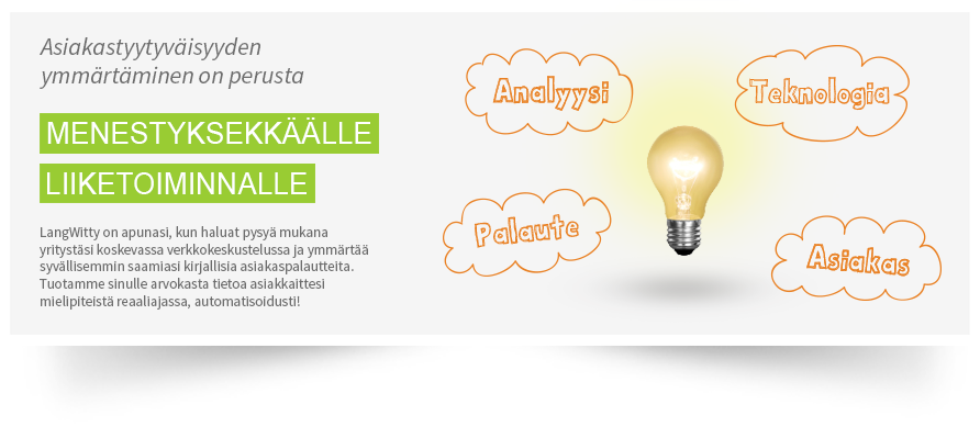 LangWitty Oy on tekstinlouhintaan ja tiedonhakuun erikoistunut ohjelmistoyritys, joka kehittää näihin menetelmiin perustuvia tietokonesovelluksia tekstimuotoisten asiakaspalautteiden automaattiseen keräämiseen ja analysointiin. Palveluidemme avulla ymmärrät paremmin asiakkaittesi tarpeita ja mielipiteitä yrityksesi palveluista ja tuotteista sekä seuraat sosiaalisessa mediassa sinua kiinnostavista aiheista käytäviä keskusteluja.
